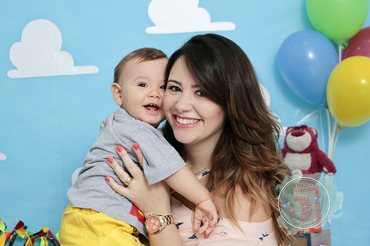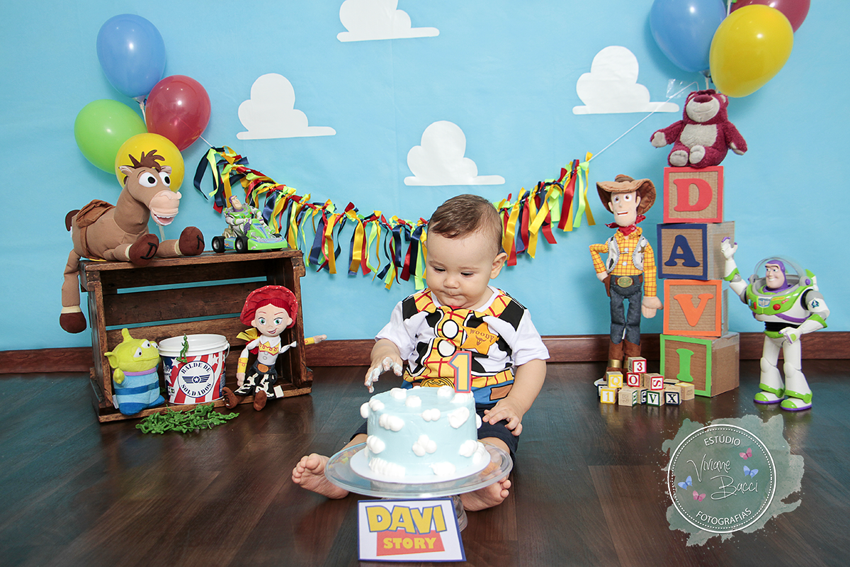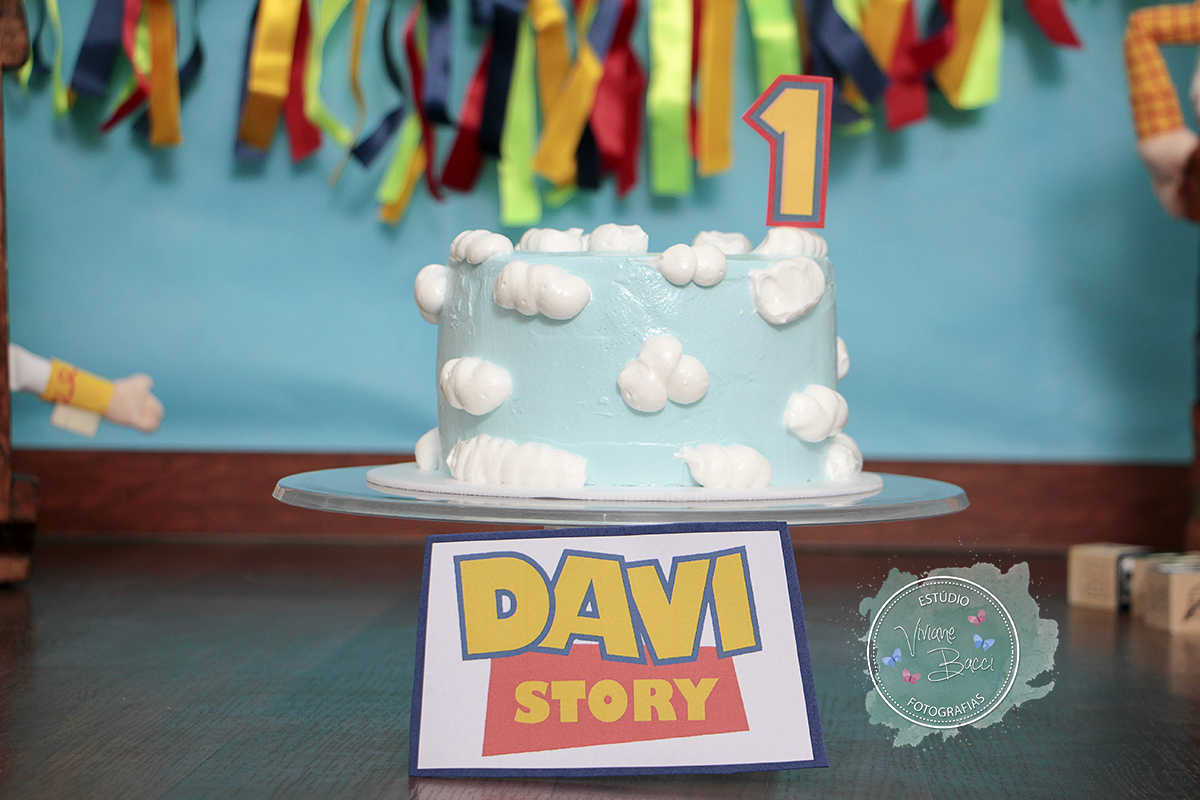 O tema foi Toy Story, bem colorido e bonito.