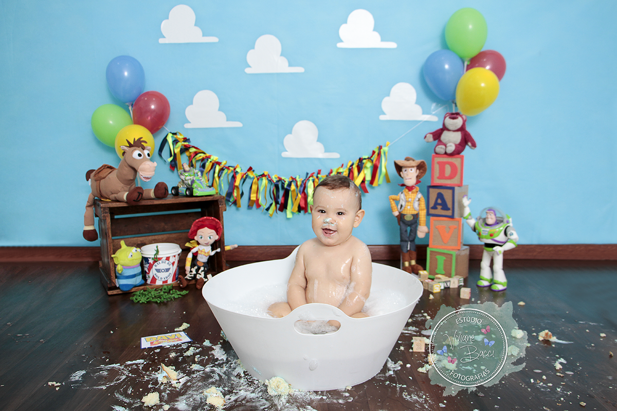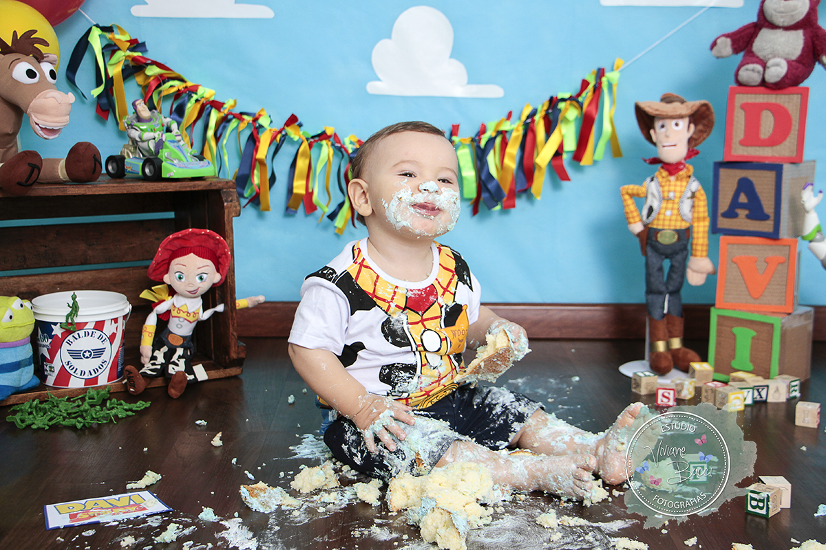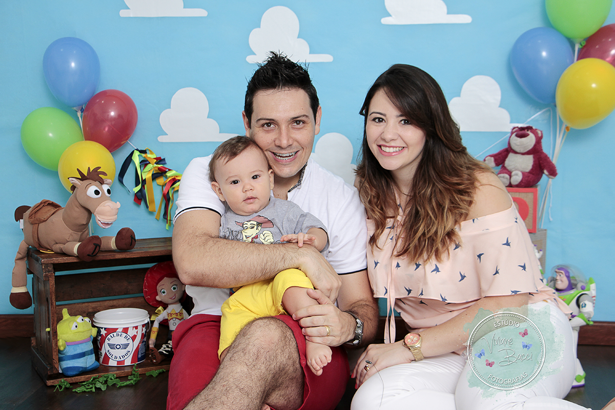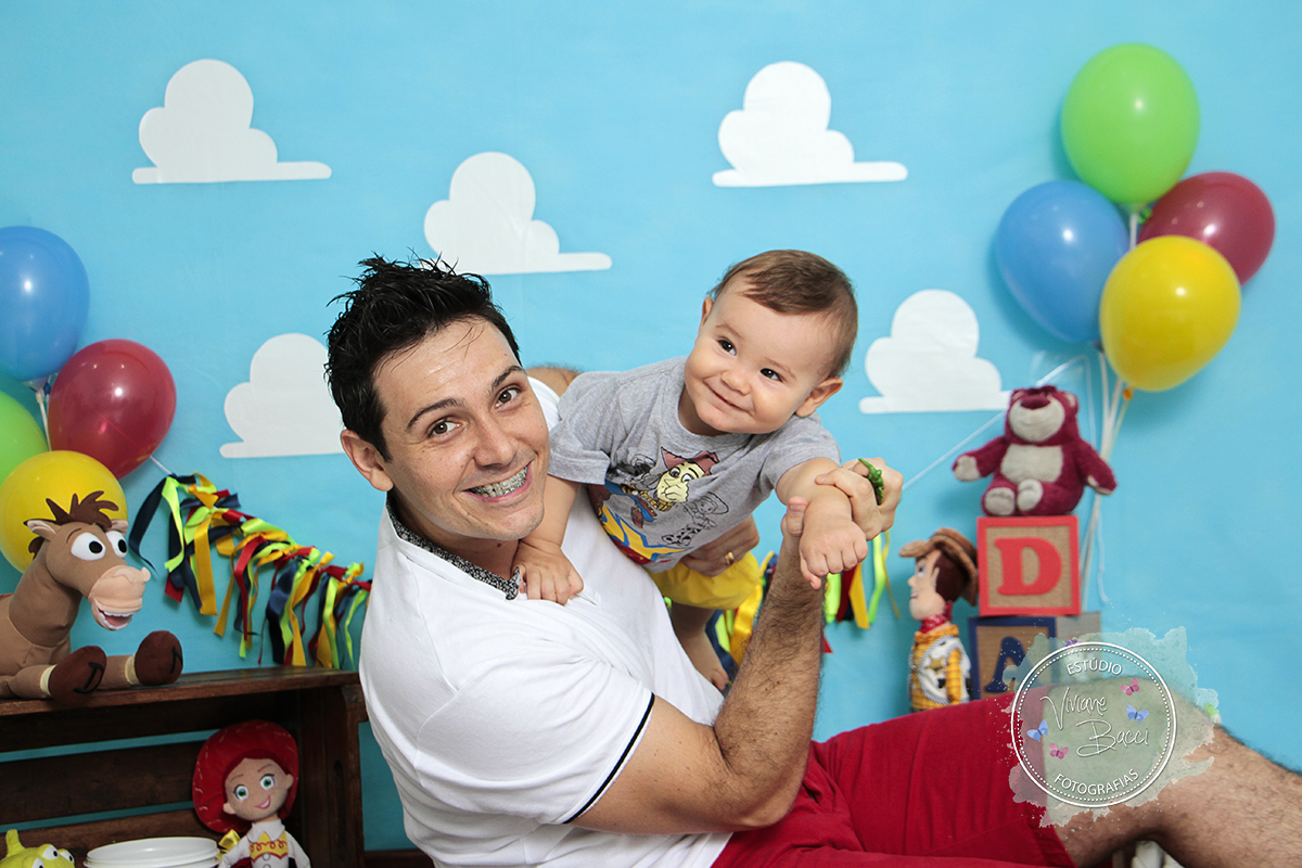 O tema foi Toy Story, bem colorido e bonito.