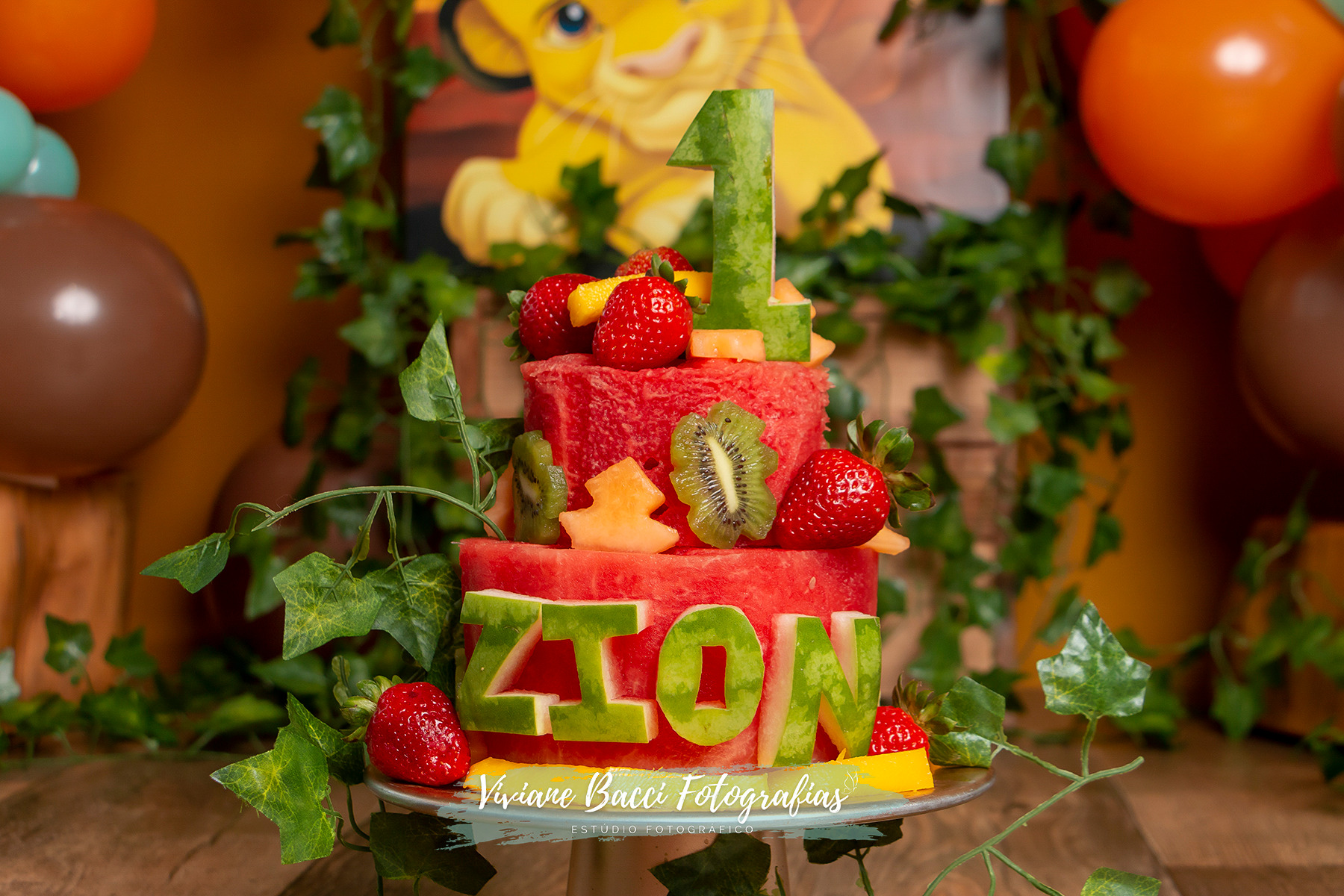 Caso opte pelas frutas, esculpimos a melancia em formato de bolo e acrescentamos as frutas favoritas do seu bebê picadas para facilitar na hora de comer. - Cenário: Seguimos a temática clean ou decoramos com balões de acordo com os tons do tema do aniversário do bebê.
